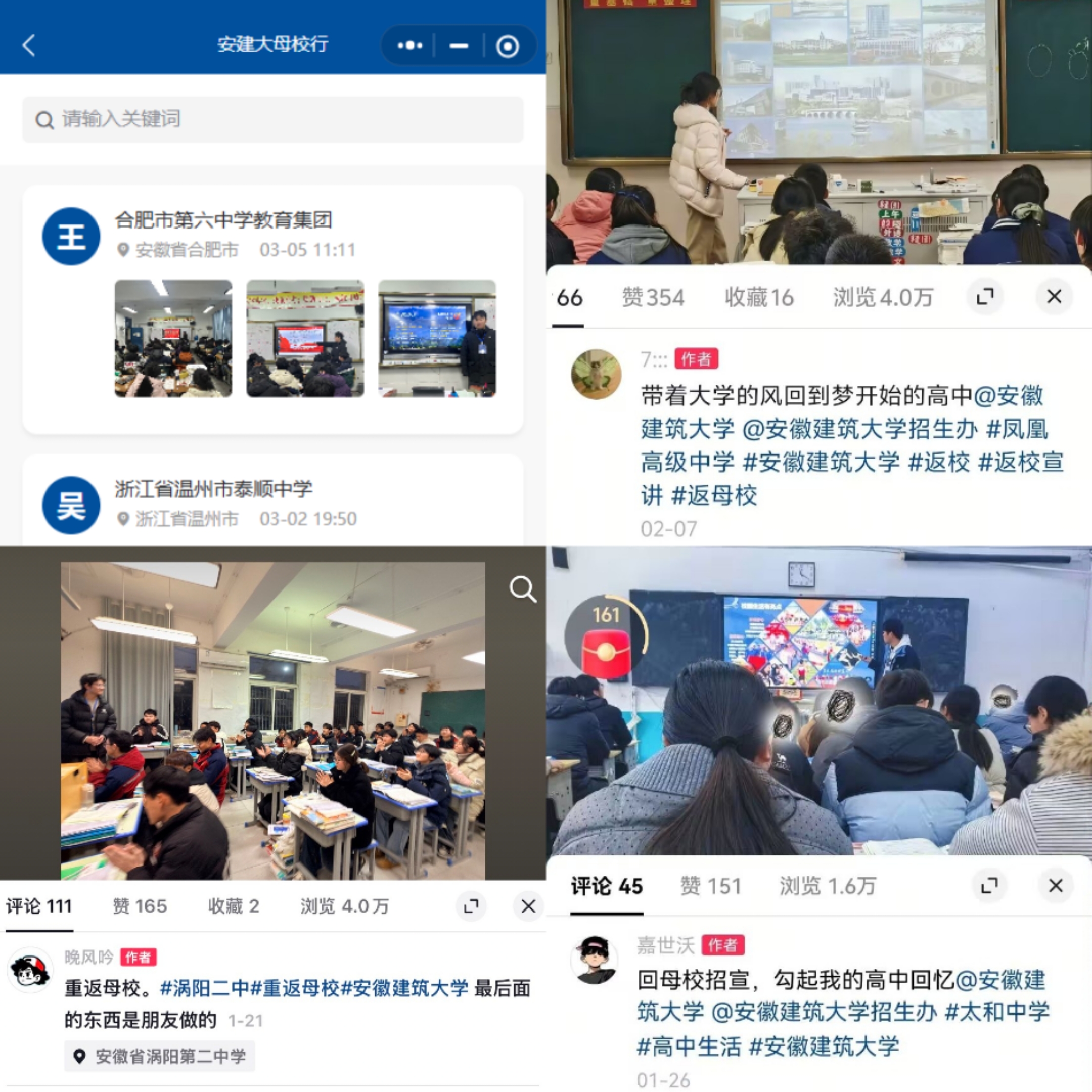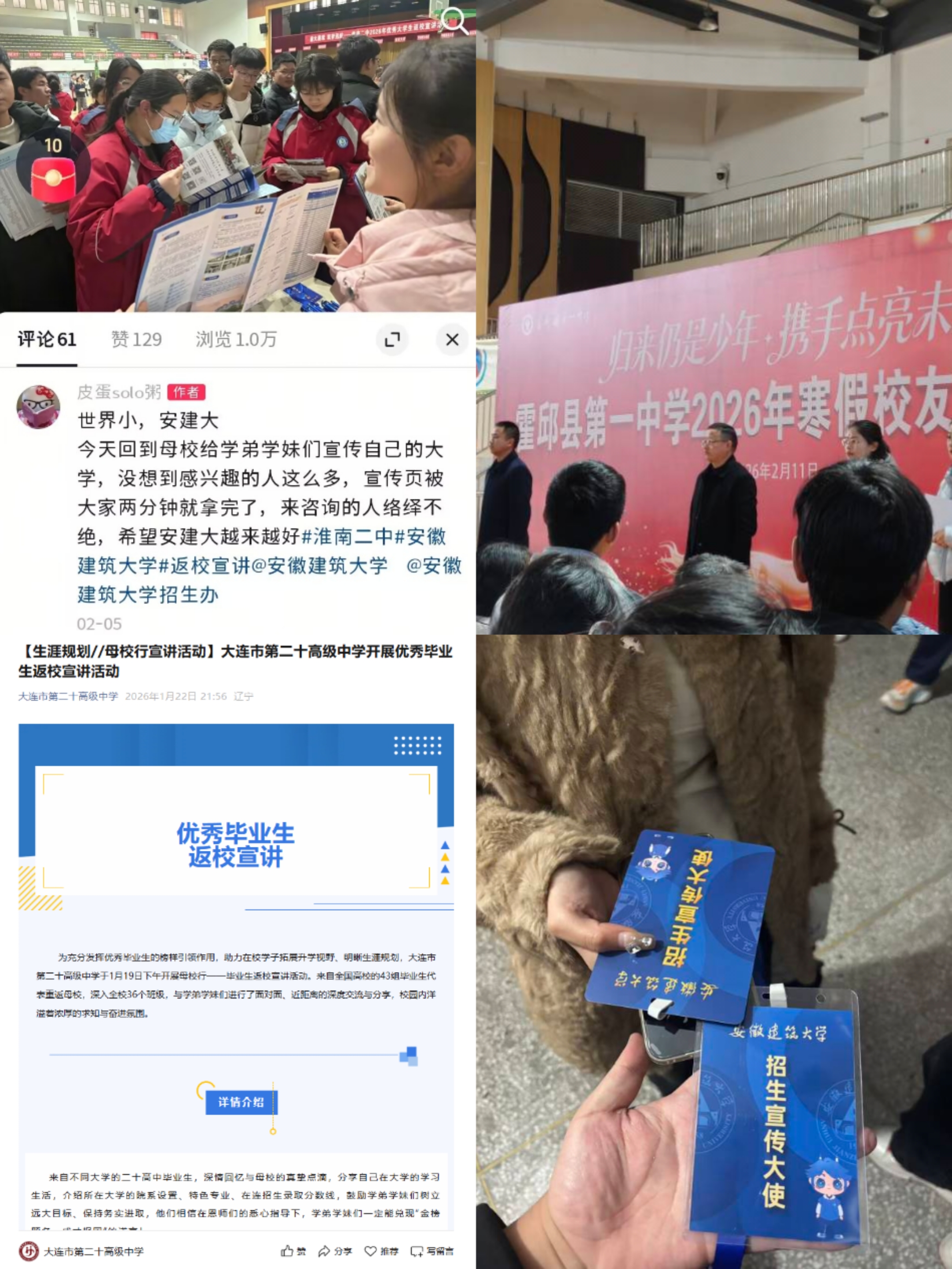 本年度,学校首次将“寒假返母校”传统品牌活动升级为春季“返家乡返母校”招生宣讲暨社会实践双重活动,服务时段突破寒假局限,精准覆盖各中学高考冲刺关键期,深度契合中学师生实际需求。本次活动在层次、地域、参与人数、持续时长等方面均创下历史新高,从松花江畔到彩云之南,从祁连山麓到东海之滨,志愿者们带着建大旗帜走遍大江南北,投身基层一线,体悟乡土民情,回报母校培养,以一场场有温度、有深度的返乡实践,践行“把论文写在祖国大地上”的初心使命。