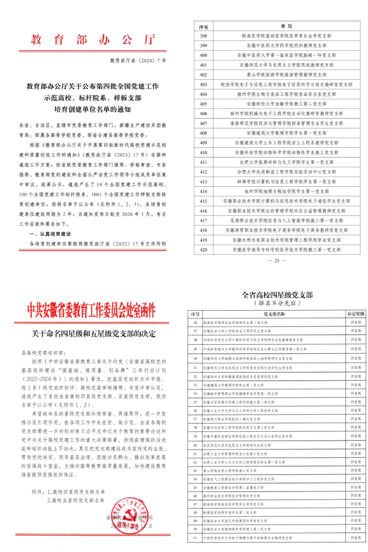 党支部2019年获批首批“全省党建工作样板支部”培育创建单位,2022年通过省委教育工委验收,2023年支部获批安徽省首批全省高校四星级党支部。近年来,支部学生党员参加全国互联网+大赛获国家级银奖2项,全国大学生市场调查与分析大赛国家级三等奖1项、省级二等奖13项、三等奖12项,全国数学建模比赛国家级二等奖2项,省级一等奖10项、二等奖4项、三等奖4项,全国统计建模比赛省级二等奖6项、三等奖6项,美国大学生数学建模竞赛Finalist奖1项、Meritorious奖1项、Honorable奖3项。支委成员赵妮同志获“安徽省高校优秀党务工作者”、“安徽省优秀共青团干部”荣誉称号。