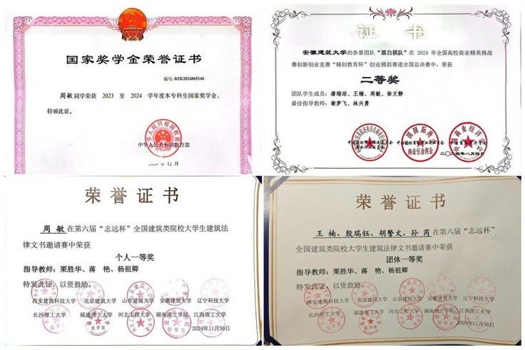 从学风建设到学科竞赛,每一份荣誉都留下了支部党员积极作为的坚实印记。2022年以来,支部学生党员校级学业奖学金获得率100%、校级三好学生或优秀团干、优秀团员荣誉称号获得率100%,毕业生党员优秀毕业生荣誉称号获得率100%。20级汪力、22级周敏荣获国家奖学金,21级计娜获“校十佳大学生”荣誉称号,20级计娜、22级王楠获得“志远杯“全国建筑类院校大学生建筑法律文书邀请赛的国家级特等奖和国家级一等奖,21级张妍等获得安徽省人民参与和促进法治工作主题征文一等奖、二等奖多项,22级高瑕镭等获得安徽省大学生模拟政府大赛一等奖、二等奖多项。