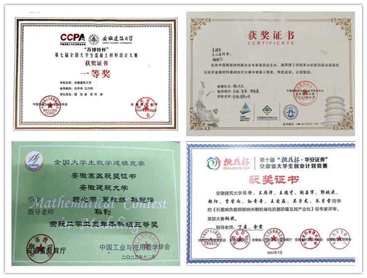 学院有优良的实验教学和学科实践平台条件,有形式多样、内容丰富的学生活动平台,支部依托这两大平台,动员党员和入党积极分子积极参加各类学科竞赛,参与“党员领航工程”、“材思月悦谈”等特色活动;加强学生党员的教育和培养,并在广大学生中扎实推进理想信念教育、爱国主义教育、爱校荣校教育等,引领大学生培育和践行社会主义核心价值观,注重创新实践能力的培养和锻炼,促进学生身心健康全面发展,切实提高育人实效,为党育人、为国育才。近三年支部成员荣获“挑战杯”安徽省大学生创业计划竞赛、“互联网+”大学生创新创业大赛、全国高校无机非金属材料基础知识大赛、全国大学生混凝土材料设计大赛、全国大学生化学实验创新设计大赛等省级以上奖励30余人次。培育创建以来,支部党员程浩、谢亮、何涛组队荣获第七届全国大学生混凝土材料设计大赛一等奖。支部成员主持、参与大学生创新创业训练计划项目14项67人次。