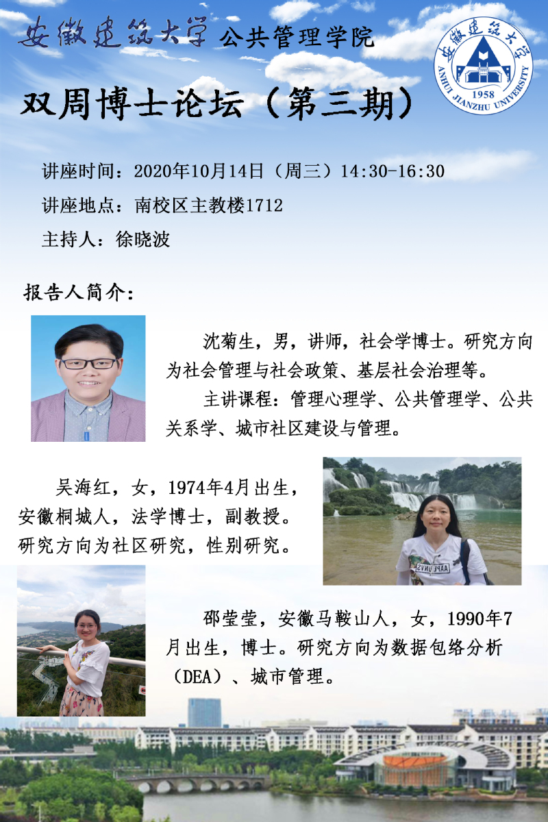 本网讯 10月14日,公管学院在南校区主教楼1712会议室开展2020-2021学年第三期“双周博士论坛”,沈菊生、吴海红、邵莹莹三位博士分享自身的最新研究成果,学院全体青年博士、研究生参加本次论坛,论坛由徐晓波副教授主持。