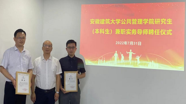 会上,黄佳豪对环安人才服务有限公司董事长叶松、国华工程科技集团有限责任公司总经理苗青、安徽远信工程项目管理有限公司董事长余松林等企业家受聘为学院研究生兼职实务导师,对环安人才服务有限公司总经理沈成、安徽远信工程项目管理有限公司总经理朱敏等企业高管受聘为学院本科生兼职实务导师表示祝贺,并对三家企业长期支持学院发展表示感谢,希望未来进一步深化校企战略合作,拓宽合作渠道,共同为社会培养高层次公共管理人才。