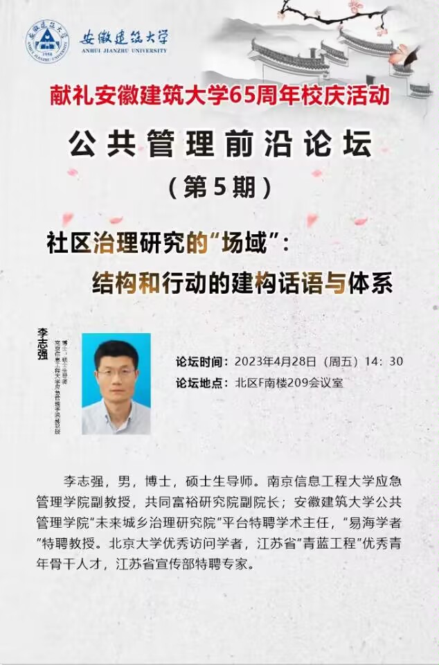 本网讯 为献礼学校65周年校庆,加强学院师生间的联系和沟通,推动人文社科科研工作高质量发展,公共管理学院于4月28日在北校区F楼三楼报告厅举办了公共管理前沿论坛(第5期)。南京信息工程大学应急管理学院副教授、beat365在线唯一官网公共管理学院“未来城乡治理研究院”平台特聘学术主任、“易海学者”特聘教授李志强受邀作“社区治理研究的‘场域’:结构和行动的建构话语与体系”主题讲座。论坛由副院长连瑞瑞主持,学院部分老师和研究生参加。