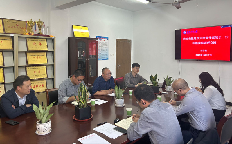 公管学院一行首先来到安徽财经大学法学院,调研学习法律硕士申报的先进经验。法学院副院长高海(主持工作)、副院长纵博、副院长赵新龙等相关人员参与研讨。会上,高海介绍了法学院的基本情况、专业设置和学科点的建设情况;黄佳豪介绍了公管学院的办学历史和专业设置等简况。双方就法律硕士点申报工作、法学学科和科研平台建设等进行了深入的探讨和交流。