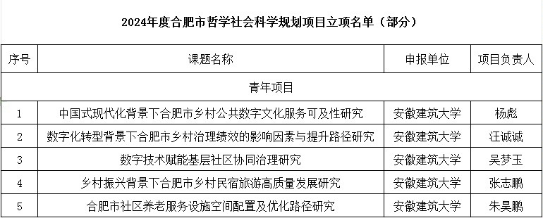 本网讯 近日,合肥市哲学社会科学规划办公室公布了2024年度合肥市哲学社会科学规划项目立项名单,公管学院研究生获立5项青年社科规划项目,约占全省立项总数的10.4%,立项总数位列全省第二。