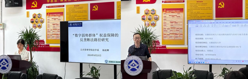 杨祖卿以《“数字弱势群体”权益保障的反垄断法路径研究》为主题,从风险透视、理论基础、价值选择三个方面剖析了数字时代背景下弱势群体的权益现状与挑战。她指出,反垄断法作为维护市场竞争秩序、促进公平正义的重要法律工具,在保障数字弱势群体权益方面大有可为。周翼虎以《安徽省农村人口流动格局演变与人地关系重构研究》为主题,从安徽省农村人口的流动行为在时间和空间上的特征和发展历程、对安徽省农村土地利用造成的影响、如何通过差别化的政策设计对农村人地关系进行重新构建这三个部分渐进式进行阐述分享。