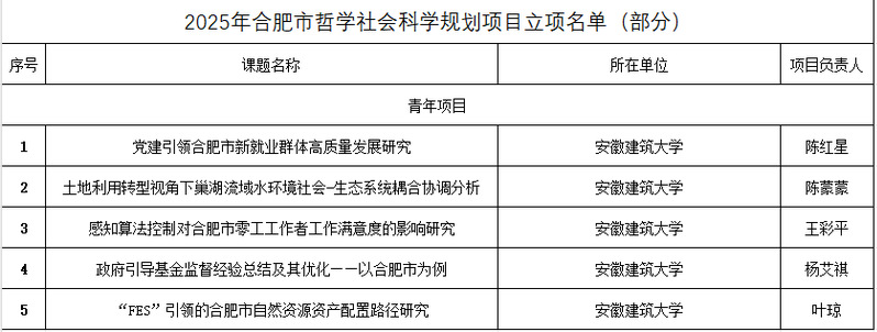 本网讯 近日,合肥市哲学社会科学规划办公室公布了2025年度合肥市哲学社会科学规划项目立项名单,公管学院研究生获立5项青年社科规划项目,立项数仅次于安徽大学。