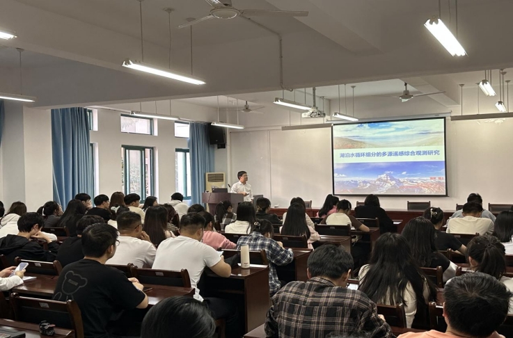 陈军博士以“湖泊水循环组分的多源遥感综合观测研究”为题,从湖泊面积、水位、深度和体积,湖泊蒸发,湖冰和湖泊水质等方面详细介绍了遥感在水方向的应用。同时,通过SAR影像、雷达及激光测高数据估算出湖泊长时间序列的水量和补给冰川储量的变化趋势;基于地球重力场卫星数据有效估算出湖泊流域地下水储量变化;利用WEB-DHM模型和Penman-Monteith模型分别估算出降水形成的入湖径流量和湖面蒸发量。最后将湖泊水量变化、冰川融水产生的径流量、降水形成的入湖径流量、湖面蒸发量、湖面降水量以及误差等因子输入湖泊水量平衡方程式来定量化评估湖泊水量平衡的气候响应机制。最后陈军博士分享了自身在青藏高原实地考察的经历与经验,引导同学们勇攀科研高峰,提升同学们对科研的热情,对科研工作有了更加深入的了解。(作者:陈广洲,陈悠 ;审稿:谢发之)