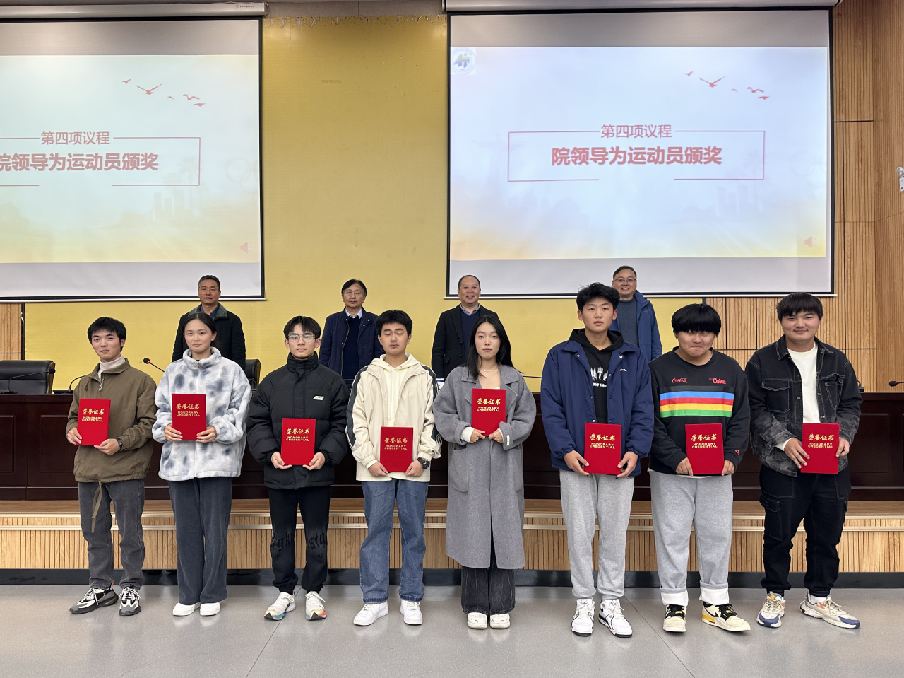 大会在嘹亮的国歌中正式拉开帷幕,表彰大会首先播放了运动会视频剪辑,再次重温环能健儿们在赛场上热血拼搏,为院争光的精彩瞬间,院党委副书记、院长谢发之宣读表彰决定,与会领导为优秀运动员颁发奖状并合影留念。院团委副书记、校运会教练员吴明轩在发言中提到,在今年的运动会中,学院面临着巨大的挑战,招生人数减少、训练时间紧张等,但即使面临着一系列的挑战,运动员们依然披荆斩棘,实现了从19到20的突破,这是自强不息、顽强拼搏的环能精神的最好体现。