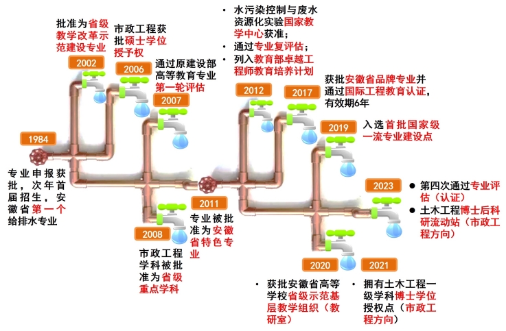 2002年,beat365官网给水排水工程专业被评为省内第一批、beat365官网第一个省级教学改革示范建设专业;2006年,市政工程获得硕士学位授予权;2007年,给水排水工程专业通过建设部专业教育评估;2009年,水污染控制与废水资源化实验教学中心获国家级实验教学示范中心,并于2013年通过教育部验收评审;2011年,给水排水工程专业被批准为安徽省特色专业;2012年,给水排水工程专业加入教育部第二批卓越工程师教育培养计划;2012年,给水排水工程专业通过国家专业教育评估(复评估);2012年,水污染控制与废水资源化实验室被批准为安徽省重点实验室;2013年,给排水科学与工程专业被批准为安徽省综合改革试点专业;2017年,通过国际工程教育认证,有效期6年;2018年,批准为安徽省卓越工程师教育培养计划2.0建设专业; 2019年,入选首批国家级一流专业建设点;2020年,批准为安徽省高等学校省级示范基层教学组织(教研室);2021年,拥有土木工程一级学科博士学位授权点(市政工程方向);2023年,第四次通过专业评估(认证),并拥有土木工程博士后科研流动站(市政工程方向),形成了完整的学士、硕士、博士和博士后人才培养体系。