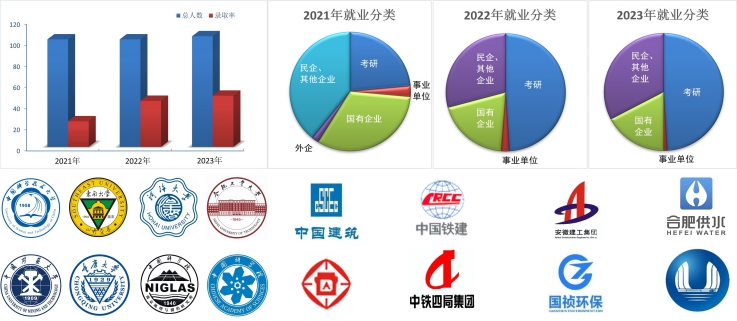 2022年和2023年本专业考研录取率分别达到43.70%和48.57%,创历史新高。50%以上进入复旦大学、中国科学技术大学、同济大学、哈尔滨工业大学、东南大学、重庆大学等985、211高校继续深造。毕业生就业率稳定在95%以上,大部分毕业生在中铁建设、中国建筑、安徽建工集团、安徽省建筑设计研究总院等大中型国有企业就业。