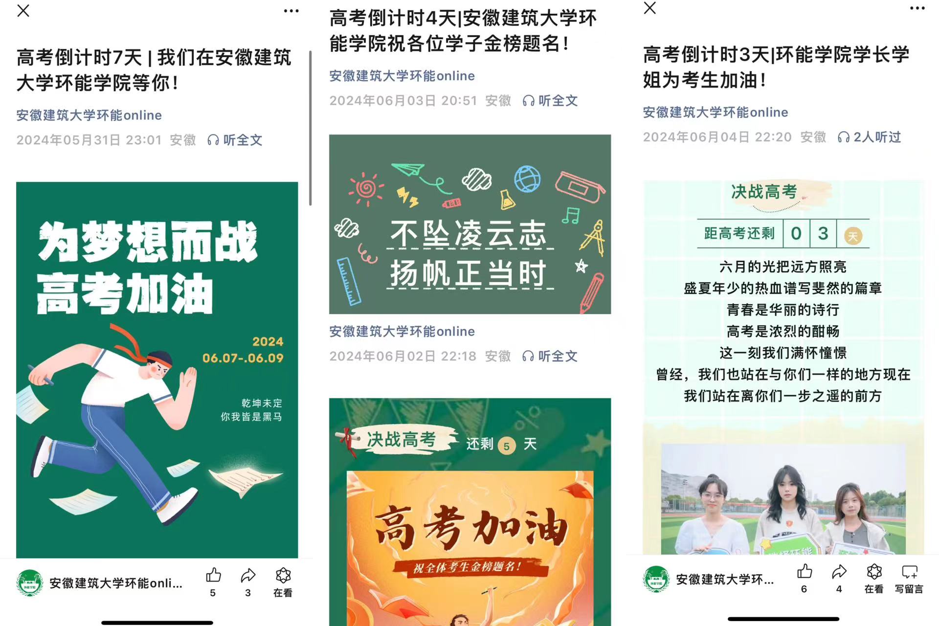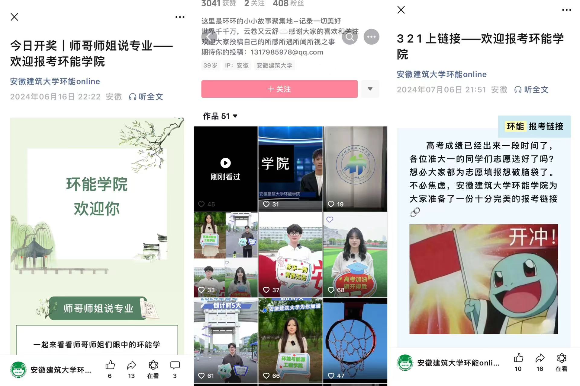 高考前后与志愿报考期间,学院充分发挥网络平台阵地优势,扩大招生传播力度,利用学院官方微信公众号“beat365在线唯一官网环能online”与抖音“环宝的快乐日常”推送6篇推文、8条视频,在给高考生们加油打气的同时,也对学院专业进行了介绍,让考生及家长多视角地了解学校、学院。招生期间,开通电话专线、组建线上咨询群,提供丰富的线上咨询途经,全天候为广大考生和家长提供详尽的志愿填报参考咨询服务。多元媒体矩阵的构建,营造了良好的招生氛围,帮助广大考生和家长客观、全面地了解学校、学院及专业,切实有效地推动了招生宣传工作的稳步开展。