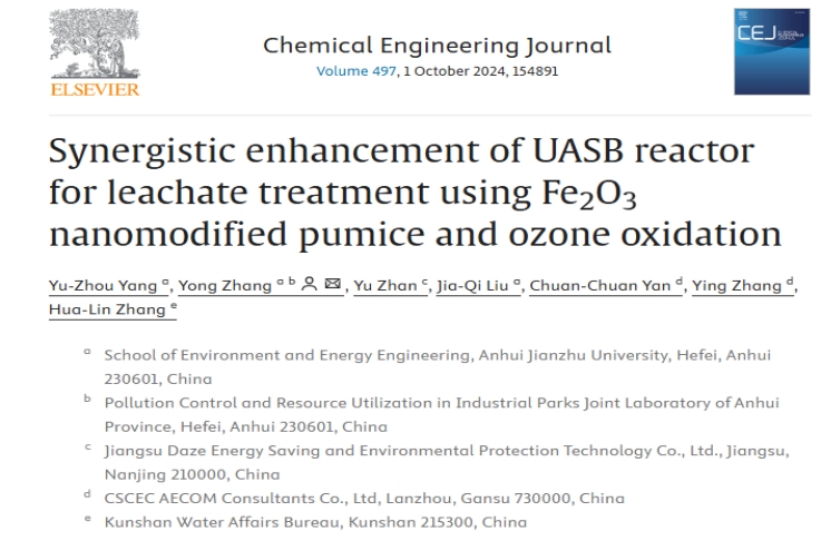 本网讯 近日,环境工程领域国际权威期刊《Chemical Engineering Journal》(JCR一区,中科院一区TOP,IF=13.3)发表了题为“Synergistic enhancement of UASB reactor for leachate treatment using Fe2O3nanomodified pumice and ozone oxidation ”的研究论文,beat365官网环境与能源工程学院市政工程专业硕士研究生杨雨舟为第一作者,指导教师张勇教授为通讯作者,beat365在线唯一官网为第一完成单位。