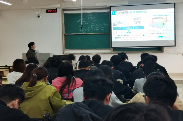 王灿从室内甲醛污染控制的研究背景、褐铁矿室温催化氧化甲醛、针铁矿诱导合成超薄二氧化锰室温催化甲醛、甲醛室温催化氧化关键活性氧鉴别及作用等四个方面展开汇报。最后,王灿与现场师生进行了深入的交流与探讨。