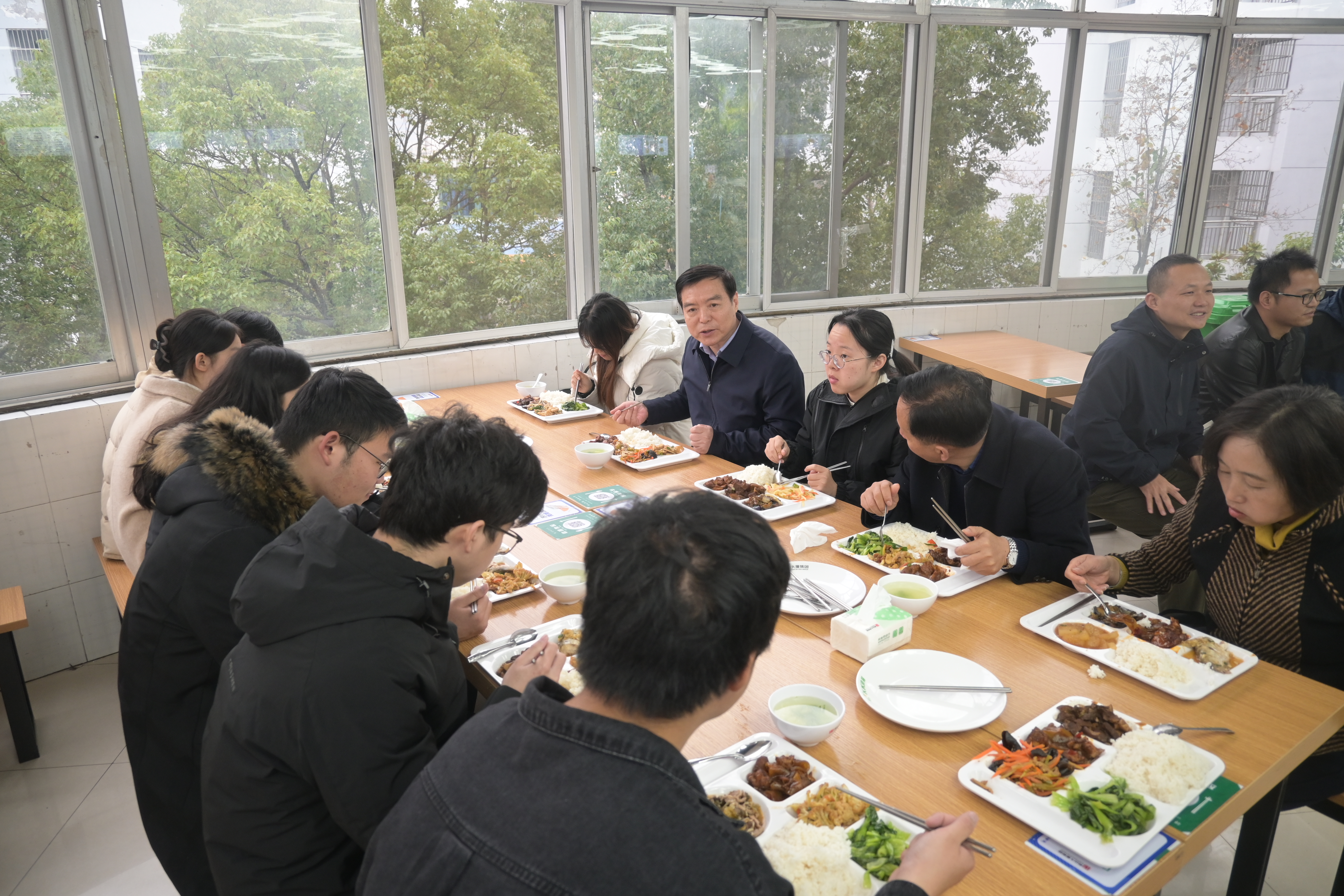 午餐时间,黄校长来到食堂,与同学们共进午餐。“同学,你觉得今天的菜色怎么样?合不合口味呀?”校长与同学们边吃边聊。学生们也放下拘谨,纷纷打开话匣子,有的表示对食堂荤菜的喜爱,认为其口感软糯;有的则对清炒时蔬的新鲜度赞不绝口。同时,也有学生坦率地提出一些建议,如希望早餐能增加一些特色小吃的种类,或是在菜肴口味上适当减少盐分等。校长认真倾听每一位学生的发言,不时与大家深入探讨菜品的烹饪细节,还分享了自己学生时代对于食堂饭菜的记忆与感受。还有两位分别来自四川和东北的同学提到希望能增加一些地方特色小吃窗口,校长笑着回应说会考虑大家的建议,争取让来自不同地域的同学都能在食堂品尝到家乡的味道。