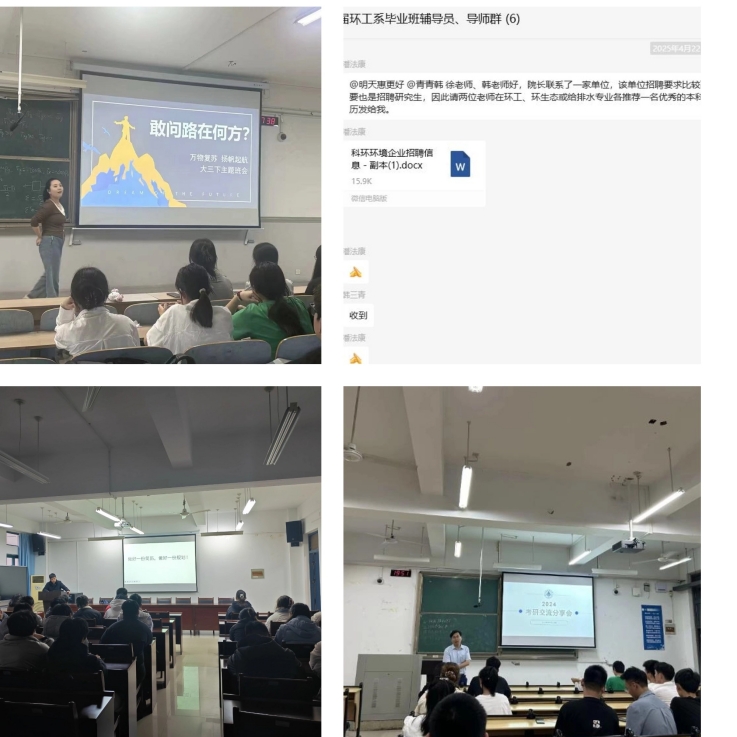 在助力学生考研与职业规划上,学院特色活动精彩纷呈。一是发挥学院特色活动,深化就业指导。环能学院以高质量升学推进高质量就业,开展“考研心里话” 考研指导活动,2024年,邀请学院考研规划指导达人吴明轩老师开展考研指导4次,耐心细致帮助学生进行院校选择、复试技巧等方面的辅导,实现32.2%升学率的优异成绩。其中环境与能源工程学院2020级给排水科学与工程专业1班学生,张准准,在2024年全国硕士研究生招生考试中,以初试343分,复试437分被清华大学录取。2024年继续深化“我与专家面对面” 就业职业规划活动,开展就业规划讲座3场,为学生提供了专业且实用的指导。二是学院积极探索校企合作新模式,深入实施“访企拓岗促就业”行动。2024年度学院奔赴池州、全椒、上海、蚌埠等地13家单位开展访企拓岗行动,旨在进一步开拓岗位资源,挖掘更全面、深入、精准的就业信息,为毕业生搭建起与企业之间的桥梁,全力拓宽学生的就业渠道。三是学院充分挖掘校友资源,积极走访优质单位,邀请中科新天地(合肥)环保科技有限公司、安徽盛威工程检测有限公司等16家校友工作单位返校招聘并开展职业规划活动,提供100余工作岗位,为学生创造更多优质就业机会。