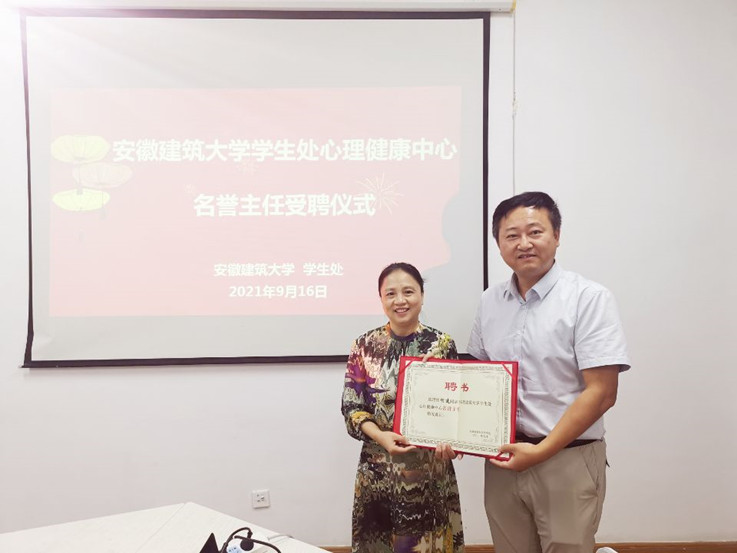 本网讯 为充分发挥心理健康教育专家的专业优势,夯实心理育人工作成效,9月16日,学生处举行心理健康中心名誉主任受聘仪式,学生处处长为马克思主义学院党总支书记(院长)谢建颁发聘书。参加受聘仪式的还有学生处副处长、心理健康中心主任和学生处心理健康中心全体工作人员。仪式由学生处处长主持。