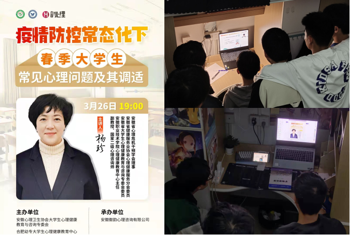 本次“疫情防控常态化下春季大学生常见心理问题及其调试”心理直播课是由安徽心理卫生协会大学生心理健康教育与咨询专委会、合肥幼专大学生心理健康教育中心与徽韵心理咨询有限公司联合举办,特别邀请安徽省心理危机干预学会杨珍理事,针对春季大学生特别是在疫情防控常态化下常见心理问题进行疏导及调试,引导广大学生提高心理免疫力,增强自我情绪调节能力,坚定战胜疫情信心!(相关学院、宣传部综合)