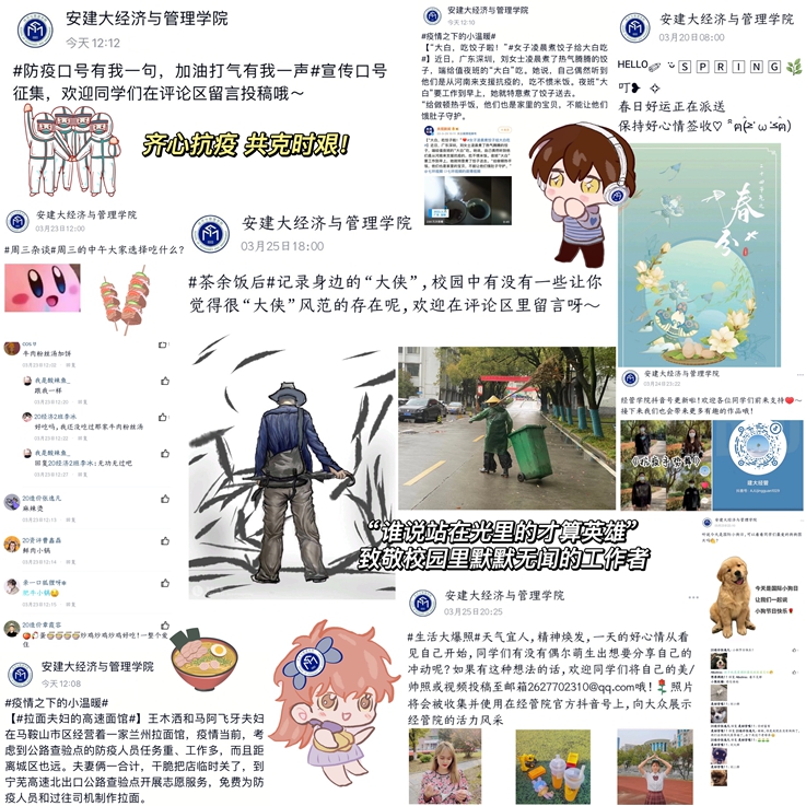 本网讯 近期国内疫情防控形势依然严峻复杂,为严防疫情输入传播风险,确保师生生命安全和身心健康,经管学子积极响应号召,众志成城、共克时艰,以积极、乐观、向上的心态助力学校疫情防控工作。