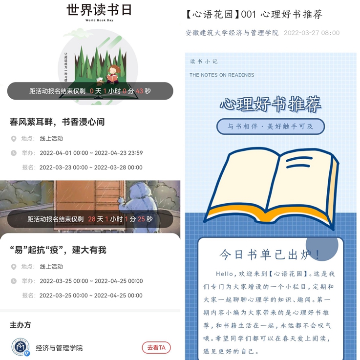 为减少学生焦虑心理、培养乐观向上态度,学院在微信公众号上开展每日好书分享,在学院易班网络思政平台举办“易”起读书、“易”起抗疫等线上活动,同学们积极参与其中,分享最爱的文字,进行抗疫相关的创作,表达对家人朋友的思念,切实做好疫情下的心理疏导,保障同学身心健康。