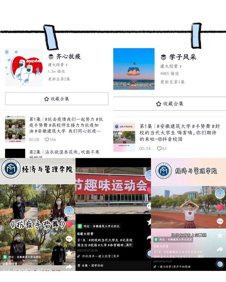 近期在抖音平台推出 《齐心抗疫》《学子风采》等系列疫情防控宣传短视频,制作创意短视频《抗疫手势舞<燎原四方>》等精彩内容,以生动、活泼的方式为同学们减轻疫情带来的恐慌,丰富课余文化生活,树立战疫必胜信心。