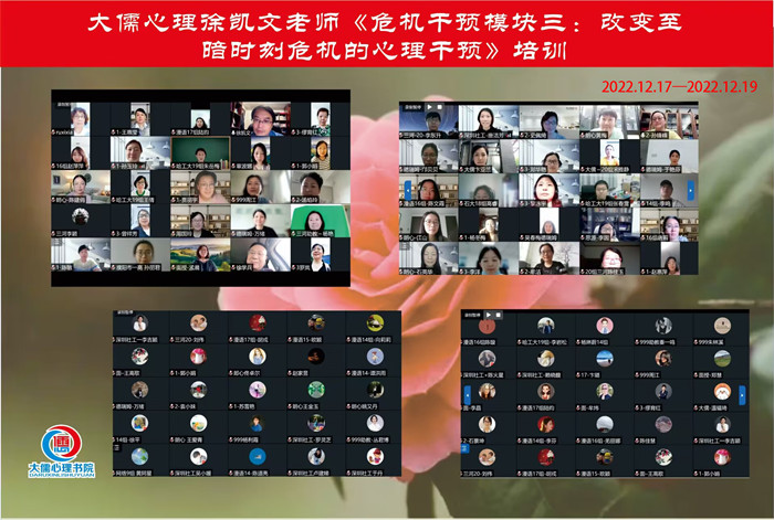 本网讯 大学生处在身心发展的重要时期,容易受家庭、学校等诸多环境因素影响,出现社会情感、心理行为等问题。尤其在当下疫情居家学习期间,育人方式从面对面改为键对键,青年心理问题隐蔽性更加凸显,需要辅导员老师具备心理问题识别能力,能够通过言语、情绪及行为的观察,识别出心理困惑的学生并进行疏导。12月17日至12月19日,建规学院心理辅导站组织辅导员老师参加大儒心理咨询徐凯文老师的《危机的行动干预与心理干预》专题培训,以提升一线学工队伍对心理问题的评估、理解及危机应对能力,形成有效和全面预防的干预体系,切实促进学生的健康成长。