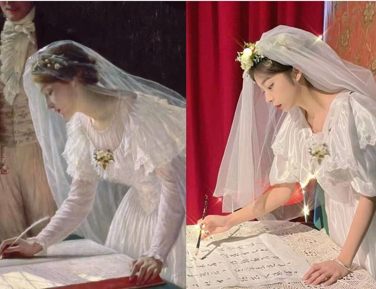 21级环境设计专业张园舒涵选择模仿的是英国著名画家埃德蒙·布莱尔·莱顿1920年创作的油画《婚礼签字》,描绘了新娘婚礼时的情景。洁白的婚纱、皎好的脸庞、认真严肃的神情生动地再现了新娘的美丽和婚礼的圣洁,让人似乎亲临其中,感受到婚礼与爱情的美好神圣。