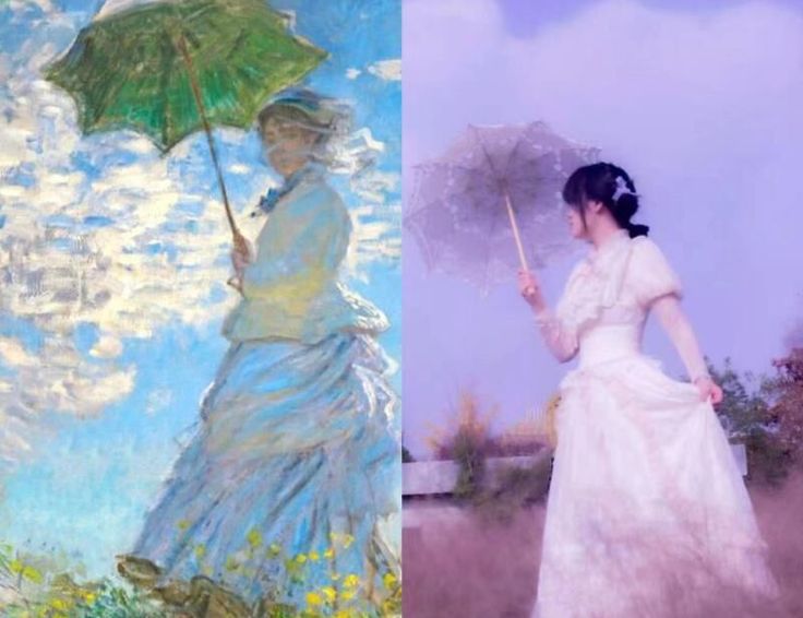 21级动画专业万欣茹同学模仿了法国印象派画家克劳德·莫奈的油画作品《撑阳伞的女人》,一袭白裙,逆光而立,形象地展示出来了莫奈印象派油画似真似幻、虚实交错的特点,再现了作品梦幻美好的独特氛围。