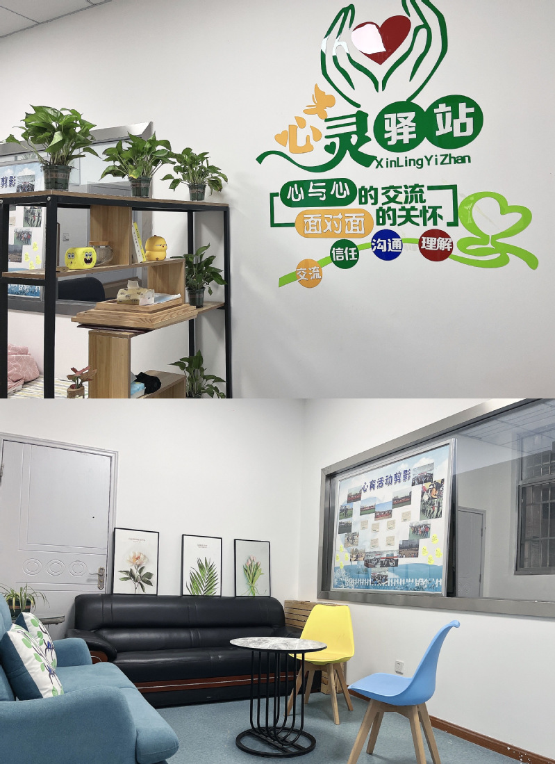 心理咨询室是老师和学生进行心理辅导的主要场所,为积极推动大学生心理健康教育工作的开展,促进大学生身心健康发展,学院不断提升心理咨询室环境建设,供心理辅导老师接待来访同学、预约登记、谈心谈话。心灵驿站持续丰富心理健康教育方面的书籍、报刊和杂志,方便有需要的学生借阅,为学生提供安全、温暖的倾诉环境。