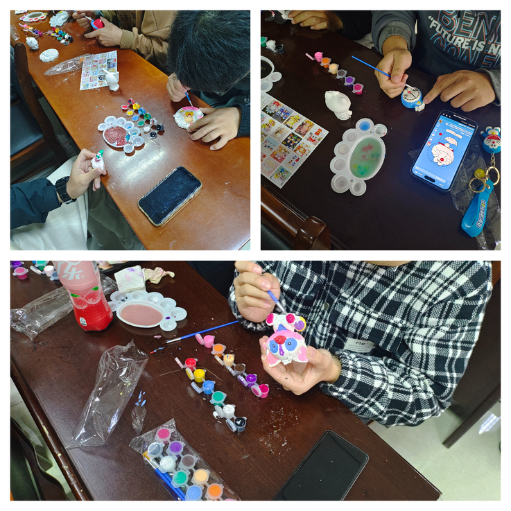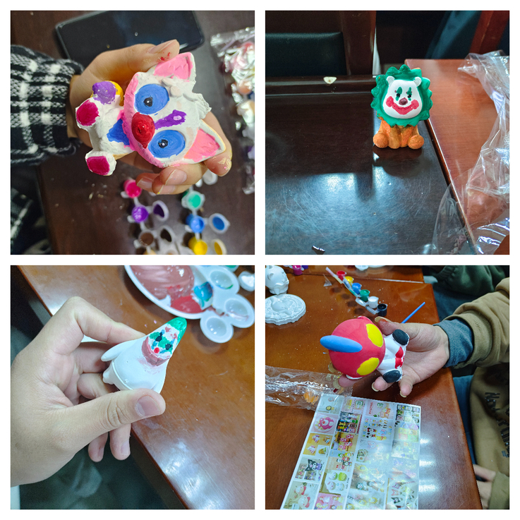 活动中,学生根据所选石膏娃娃样式,发挥想象力,拿起画笔蘸着颜料开始了自己的创作,憨态可掬的博美狗、甜美可爱的幸运猫、古灵精怪的奥特曼,每一个石膏娃娃都凝聚着同学们的创意和思考。经过同学们的一番DIY之后,素白的石膏胚仿佛具有了生命。完成自己的创作后,同学们一起展示并分享了自己的作品。