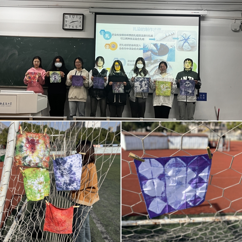 活动现场,心理委员为同学们详细介绍了扎染的历史和文化背景,并通过视频播放的形式,带大家学习基本的扎染技巧和步骤,随后,同学们领取布料和染料,开始动手制作自己的扎染作品,折叠、捆扎、染色,同学们充分发挥自己的想象力进行创作,有的按照图样将方巾折叠捆扎,有的按照自己的方式进行捆扎,完成染色后,同学们解开结扎的部分,抖开织物,展现层次丰富、色彩斑斓的扎染作品。