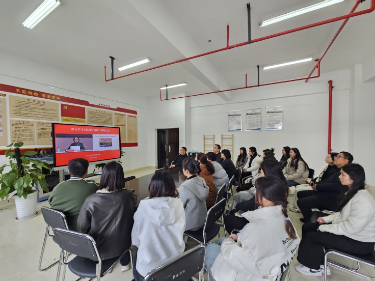 本网讯 3月18日,艺术学院组织部分师生在学院会议室集体收看学习贯彻2025年全国两会精神的专题宣讲直播报告会。本次宣讲会由十四届全国人大代表、中共安徽省委讲师团理论宣讲专家、中共安徽省委党校(安徽行政学院)党的建设教研部主任吴梅芳教授担任主讲。学院领导班子成员、党支部书记、师生代表参加,共同聆听这场宣讲报告。
