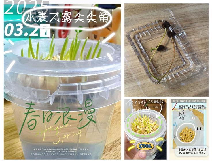 “春种一粒粟,秋收万颗子。”这句古诗不仅描绘了农作物的生长过程,也象征着希望与收获。艺术学院为每位参与者提供了水培植物的种子和栽培工具,详细讲解了水培植物的生长条件和日常培育要点。同学们在领取种子后开始了充满期待的“春日播种之旅”,记录下种子从发芽到长出嫩叶的生长轨迹图,撰写生长日记或制作生长手帐,分享自己的感受与体会。