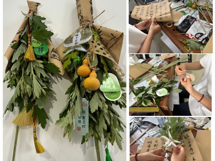 作为端午传统习俗,家家户户门前悬艾草以驱邪纳福的文化记忆延续千年,其独特的香气和形态也极具艺术装饰价值。同学们将新鲜的艾草与菖蒲、小雏菊等植物组合,搭配香囊、竹篮、卡片、葫芦等元素来装饰。随着一个个造型别致的艾草花束逐渐成型,艾草的清香弥漫在教室的每个角落,将端午的传统文化氛围提前带到了校园。