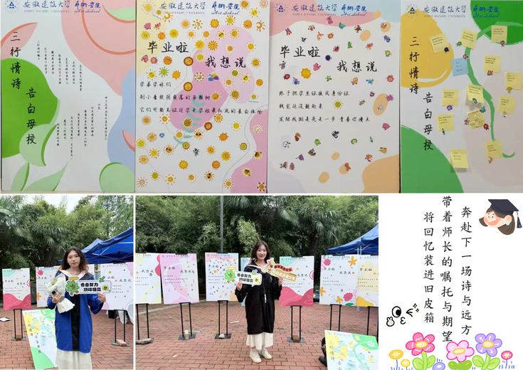 “绘忆青春・留韵校园”区域成为情感抒发的焦点。巨幅毕业主题签名墙前,毕业生们郑重留下个性签名、深情寄语或创意涂鸦。“三行情诗展板”吸引同学们驻足,他们或品读佳作,在心仪展板粘贴心意贴纸;或即兴创作,书写献给母校的质朴诗句,字里行间流淌着对菁菁校园的深切眷恋与由衷感恩。色彩与文字在此刻成为情感的载体,将同学们心中难以言说的眷恋、感激与祝福,深深烙印在校园的一墙一板之上,让无形的深情在斑斓的色彩和真挚的文字中得以永恒寄放。