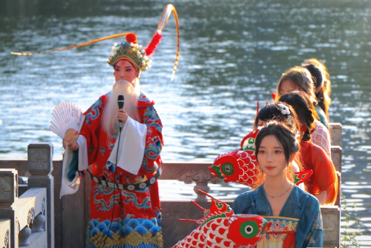 活动筹备自八月中旬启动,学院领导班子高度重视,专业教师、学院团委积极响应,和校团委、体育教学部组建专业策展团队,实施“日清周结、责任到人”的项目化管理机制,系统推进活动进展。艺术学院师生依托自身专业特色,组织非遗展示单元的设计与布展,将非遗元素进行当代化转译,涵盖傩戏面具、木刻版画、绒花、民俗服饰等徽州传统工艺品,以及大幅藤编、大型鱼灯、大型剪纸等传统艺术作品,同时组织书法、国画、葫芦刻画等手工艺作品展,现场形式多样丰富,得到了参与嘉宾、新生和家长们的一致好评。特别是动态演出环节的黄梅戏展演,青年师生演出《天仙配》《女驸马》等经典唱段,展现戏曲艺术魅力,让人印象深刻。夜间的花灯巡游环节,紫云路校区灯光璀璨,非遗文创、鱼灯巡游与戏曲演出交织,吸引众多新生驻足,气氛热烈。