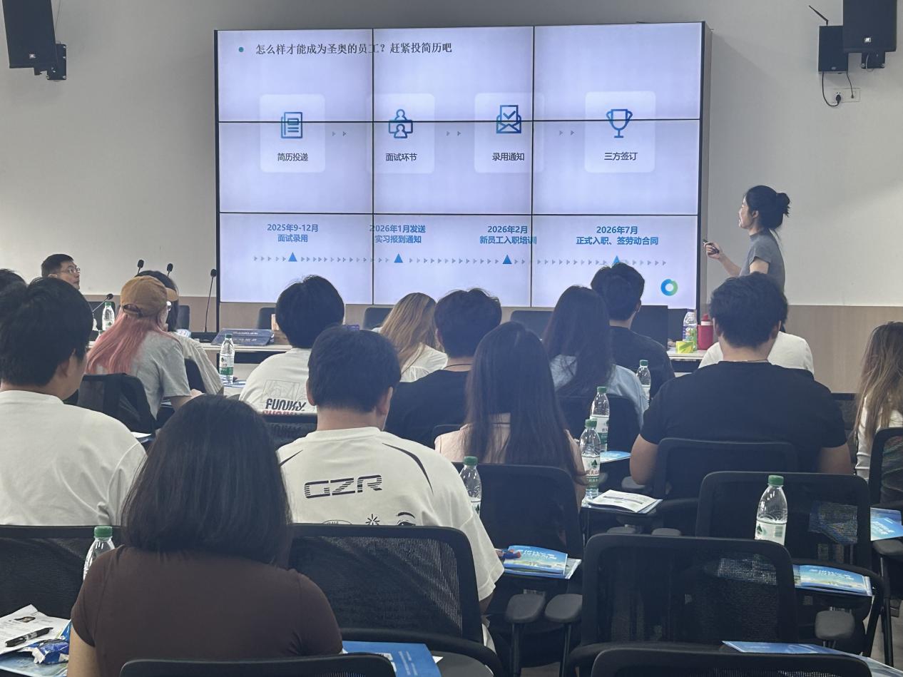 宣讲会上,圣奥集团区域总经理钱李仁介绍了集团的基本情况、发展历程及发展成就,分享了圣奥集团的未来规划和发展目标,未来将积极拓展新的市场领域、加强技术创新和人才培养等方面情况。